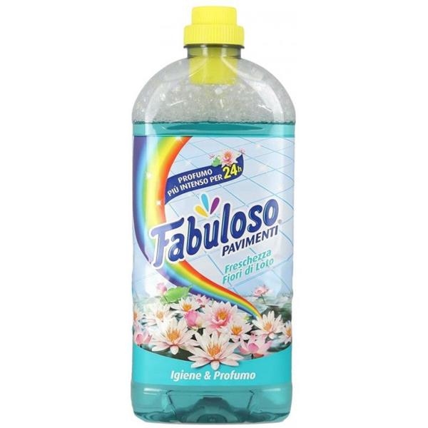 Fabuloso Pavimenti Fiori di loto, detersivo pavimenti profumante, igiene e profumo, rimuove lo sporco e sgrassa facilmente tutte le superfici lavabili lasciando un fresco profumo di pulito.La sua intensa fragranza rilascia in tutta la casa un'inconfondibile profumata freschezza che dura 24h.
